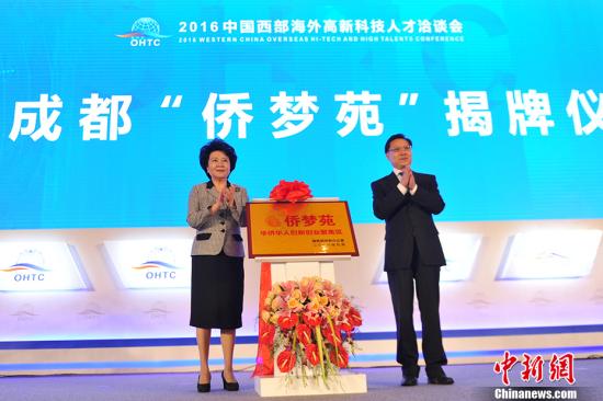 9月13日,国务院侨办主任裘援平与中共四川省委书记王东明共同为四川成都“侨梦苑”揭牌。当日,由国务院侨办、四川省委省政府和欧美同学会共同主办的2016中国西部海外高新科技人才洽谈会在成都开幕。近600名海外华侨华人英才相聚成都,分享西部和四川发展新机遇。 中新社记者 张浪 摄