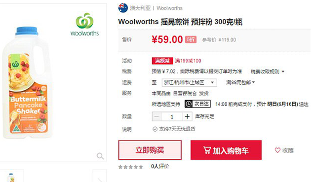 另一款300克的摇晃煎饼预拌粉(Shake Pancakes 300g Mixing Powder)在澳洲售价为1.5澳元,但在国内的价格却达到59元人民币(即11.5澳元)。
