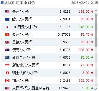 据中国外汇交易中心的最新数据显示,8月1日人民币对美元汇率中间价报6.8293元,下调128个基点。中国人民银行授权中国外汇交易中心公布,2018年8月1日银行间外汇市场