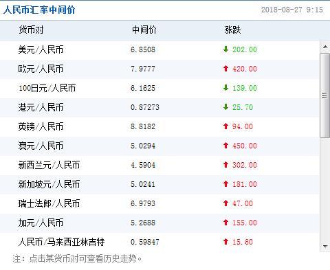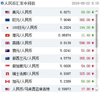 中国外汇交易中心的最新数据显示,8月22日人民币对美元汇率中间价报6.8271元,上调89个基点。中国人民银行授权中国外汇交易中心公布,2018年8月22日银行间外汇市场人