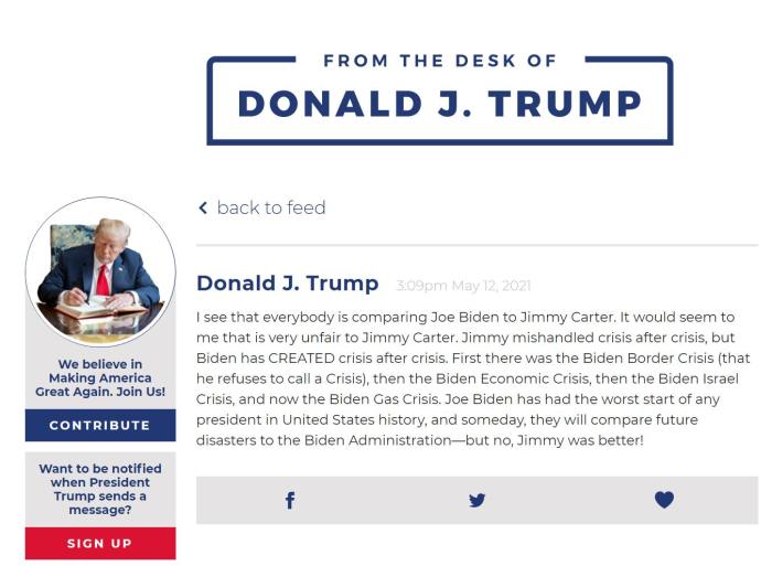 中新网5月13日电据外媒报道,当地时间12日,美国前总统特朗普在其个人网站上“炮轰”现总统拜登,称拜登“制造了一个又一个危机”,他任期的开局是“美国史上最糟糕”