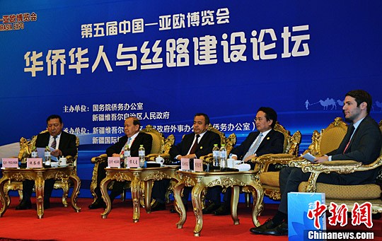 图为论坛现场。中新社发孙想录摄中新社乌鲁木齐9月21日电(付强)第五届中国—亚欧博览会“华侨华人与丝路建设论坛”21日在乌鲁木齐举行,国务院侨办副主任谭天星,新