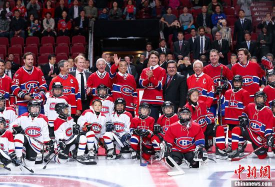 当地时间9月23日,到访蒙特利尔的中国国务院总理李克强在加拿大总理特鲁多陪同下,参观当地“加拿大人”冰球队,获赠印有他名字的球衣。李克强穿上球衣,与特鲁多一起