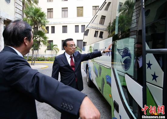 当地时间9月25日下午,中国国务院总理李克强在古巴首都哈瓦那体验中国出口的宇通客车,考察中国装备“走出去”情况。中新社记者刘震摄中新社哈瓦那9月25日电(记者郭