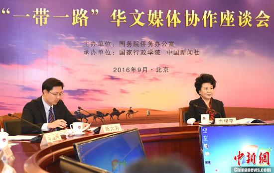 9月26日,由中国国务院侨办主办,国家行政学院、中国新闻社承办的“一带一路”华文媒体协作座谈会在北京举行。国务院侨办主任裘援平出席座谈会并讲话。中新社记者张