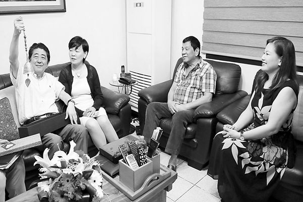 安倍晋三偕夫人参观杜特尔特的私宅,在收到赠送的礼物后喜笑颜开。日本共同社13日报道说,日本首相安倍晋三本月12日至13日访问菲律宾,与菲律宾总统杜特尔特进行首脑