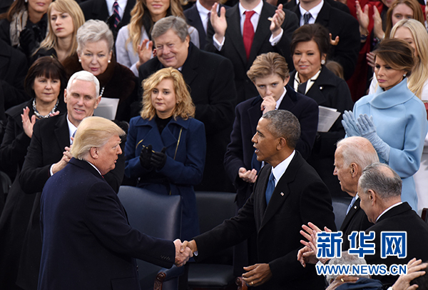 1月20日,在美国首都华盛顿国会山,特朗普(前左)发表就职演说后与前任总统奥巴马握手。当日,美国当选总统、共和党人特朗普在美国首都华盛顿国会山举行的就职典礼上