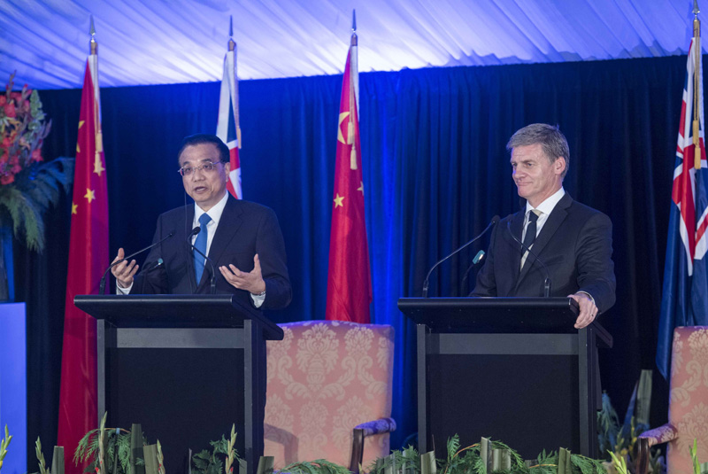 27日中午,李克强总理和新西兰总理英格利希结束会谈后共同会见记者。李克强说,此访期间中新宣布实现自贸升级版谈判,必将有力推动两国贸易发展,向地区和世界发出共