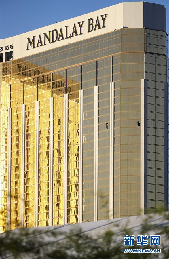 这是10月3日拍摄的美国拉斯维加斯曼德勒海湾酒店,枪手所在房间破损的两扇窗子清晰可见。拉斯维加斯当地时间1日晚发生严重枪击事件,造成数百人死伤。截至3日早晨,