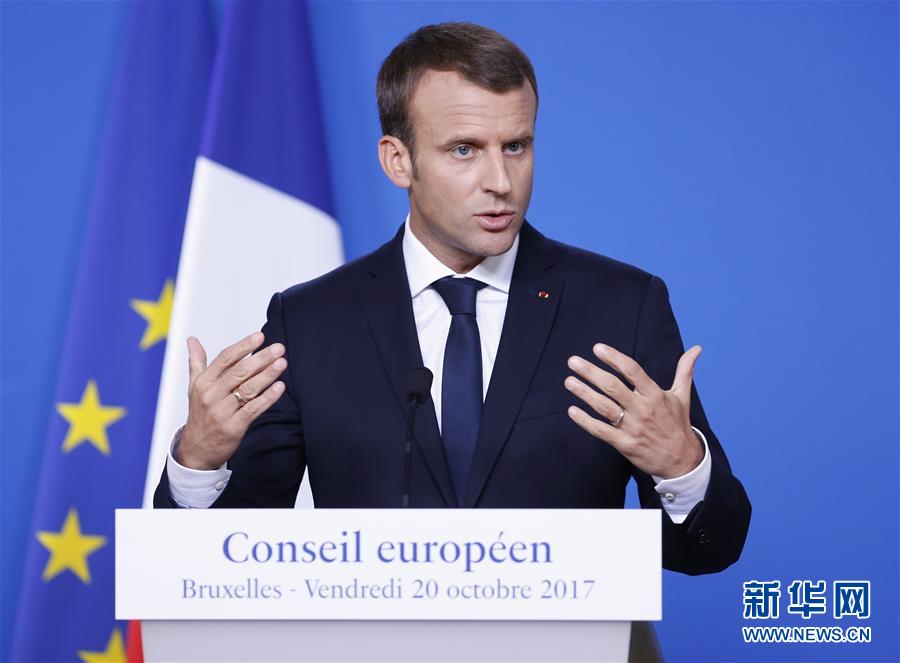 10月20日,在位于比利时布鲁塞尔的欧盟总部,法国总统马克龙出席新闻发布会。欧盟27国领导人20日在布鲁塞尔宣布,将在欧盟理事会(除英国)以及谈判团队内部启动“脱欧