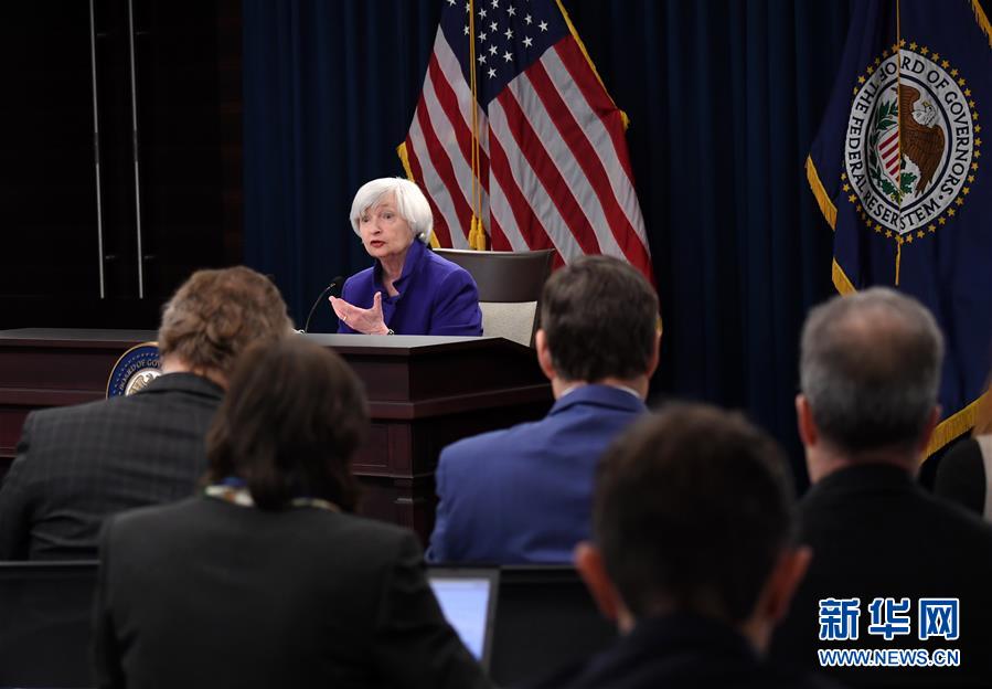 12月13日,美国联邦储备委员会主席耶伦在华盛顿举行的新闻发布会上讲话。美国联邦储备委员会13日宣布将联邦基金利率目标区间上调25个基点到1.25%至1.5%的水平,这是