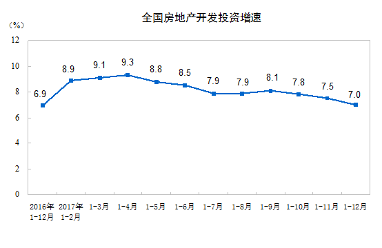 国家统计局全文如下:一、房地产开发投资完成情况2017年,全国房地产开发投资109799亿元,比上年名义增长7.0%,增速比1-11月份回落0.5个百分点。其中,住宅投资75148亿