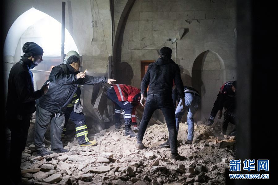 1月24日,在土耳其靠近叙利亚边界的基利斯省省会基利斯市,救援人员在遭火箭弹袭击的清真寺内清理废墟。当日,土耳其边境城市基利斯市遭来自叙利亚境内的火箭弹袭击