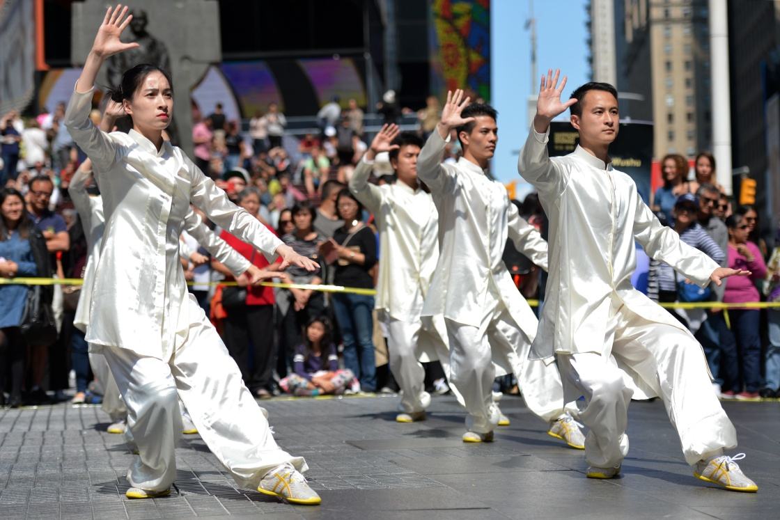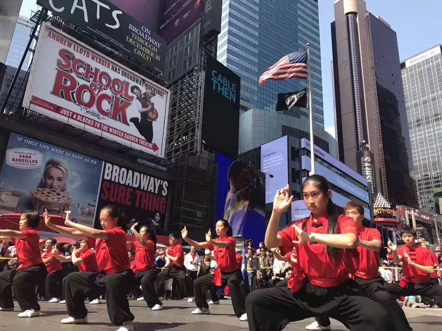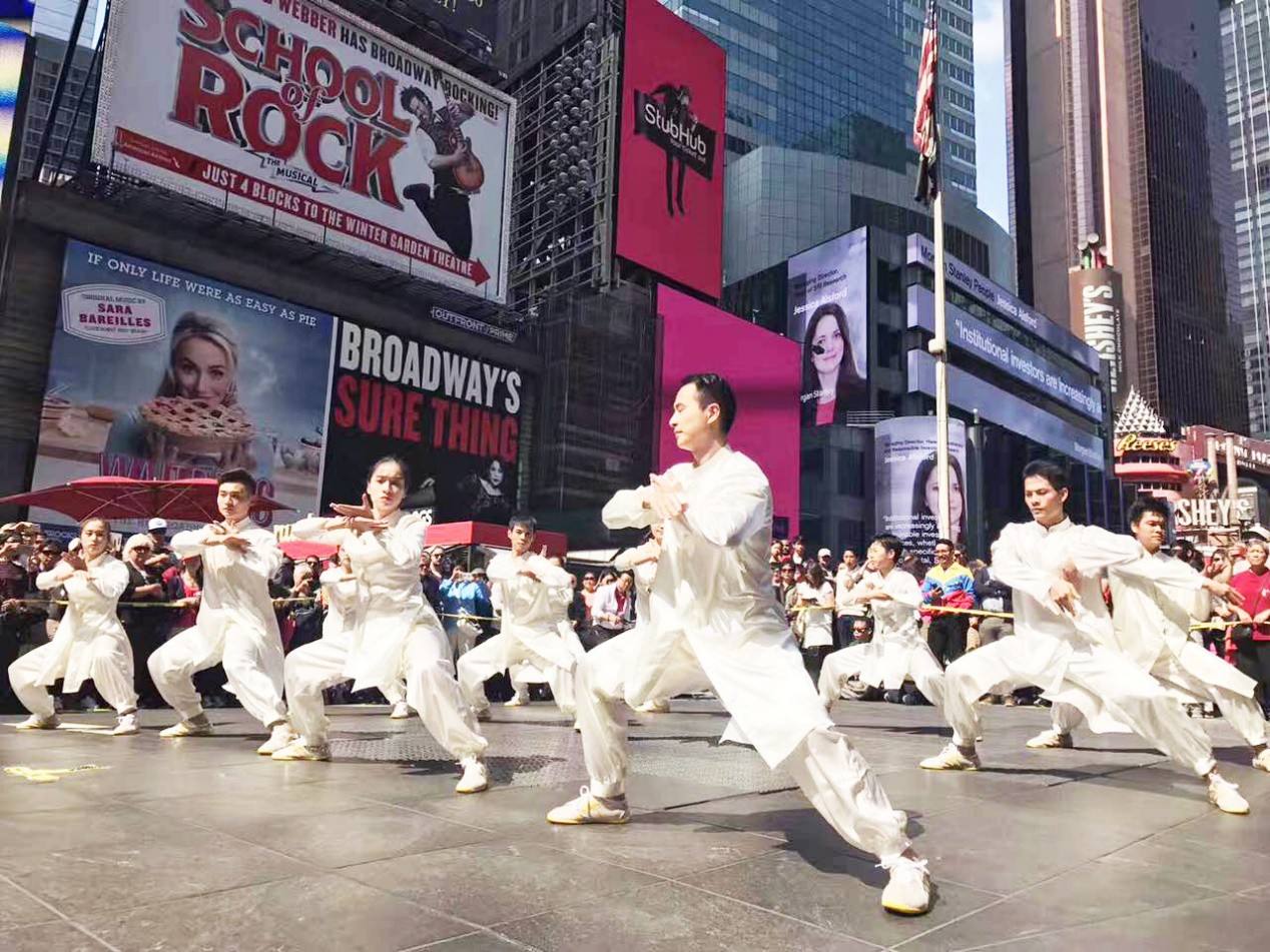 9月11日,有着“世界的十字路口”之称的纽约时代广场上,拳风凌厉、风生水起,数十位不同肤色的武术运动员身着飘逸的武术服,打起了太极拳。一招一式的真功夫,配合行云流水的太极拳宣传片,引来来往游客在此驻足拍照。国际武术联合会执行副主席吴廷贵、武术形象大使李连杰以及美国市政厅代表等当地嘉宾到场观看了整场活动。