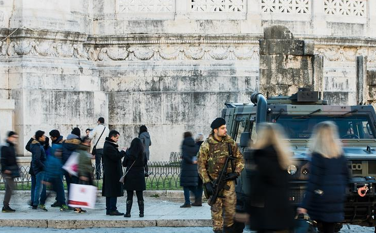 12月29日,在意大利首都罗马,士兵在威尼斯广场执勤。新年前夕,欧洲各国主要城市在交通枢纽、旅游景点等地加强安保措施,防止袭击事件发生。 新华社记者 金宇 摄