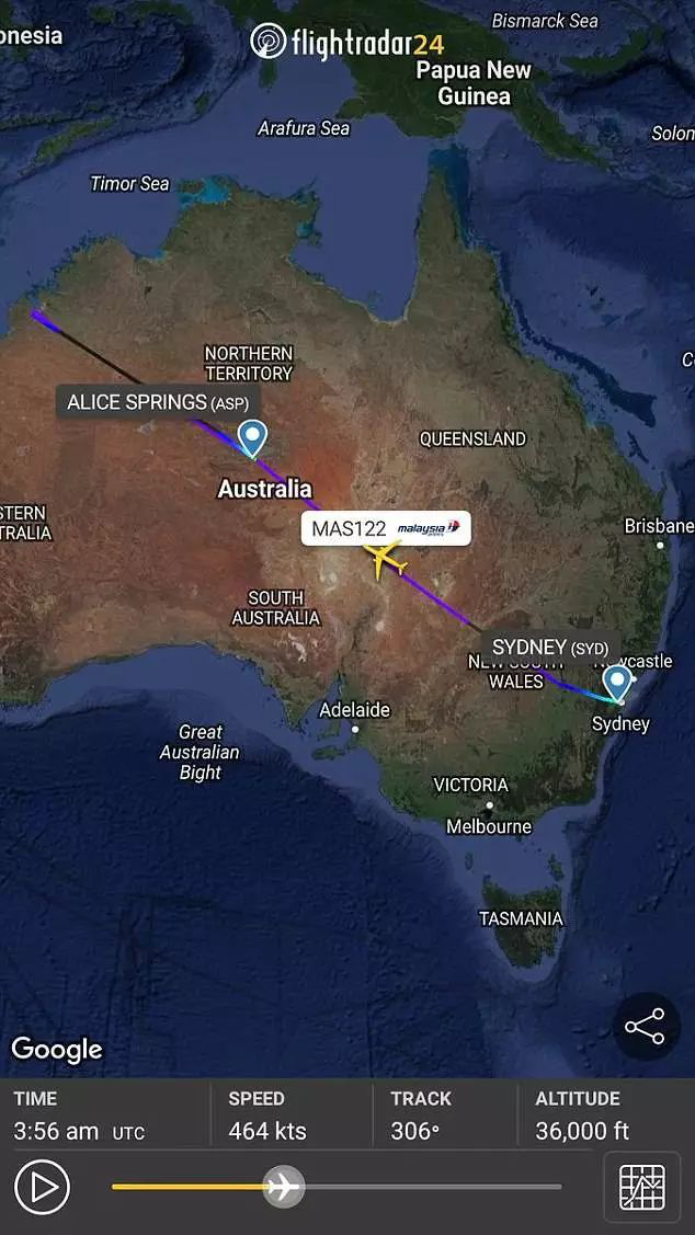 该航班于下午1点零6分离开悉尼机场,当日下午5点48分在Alice Springs降落。