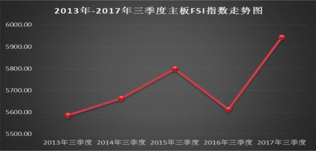 总体而言,我国非金融类上市公司财务安全总指数(Financial Security Index,简称:FSI总指数)2017年三季度出现明显拐点,上升势头非常明显,2017年三季度上市公司FSI总指数同比上升203.53个基点,涨幅3.44%,FSI总指数重回6000点大关(6000点相当于60分,40分及格),上升速度创近6年新高,是近6年中表现最好的一次。因此,赛弥斯(Themis)分析预测,2018年上半年,我国非金融类上市公司总体财务安全状况将明显上升。