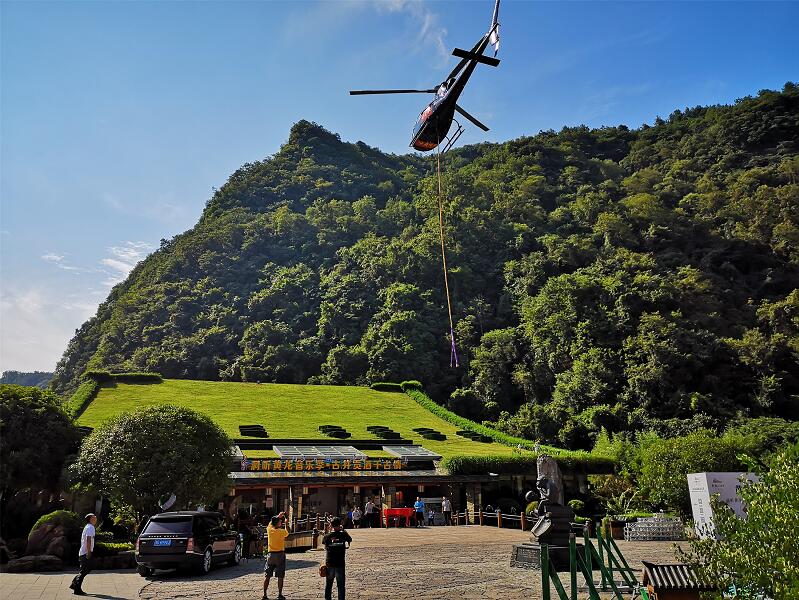 直升机飞越武陵源黄龙洞哈利路亚音乐厅的绿茵屋顶,这个屋顶将是2018黄龙音乐季的开幕式主会场。
