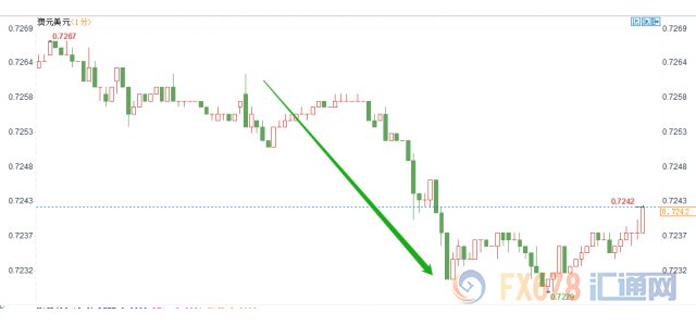 因澳大利亚贸易顺差不及预期,澳元兑美元盘中走低,刷新六个交易日低位至0.7231,日内跌幅0.47%。