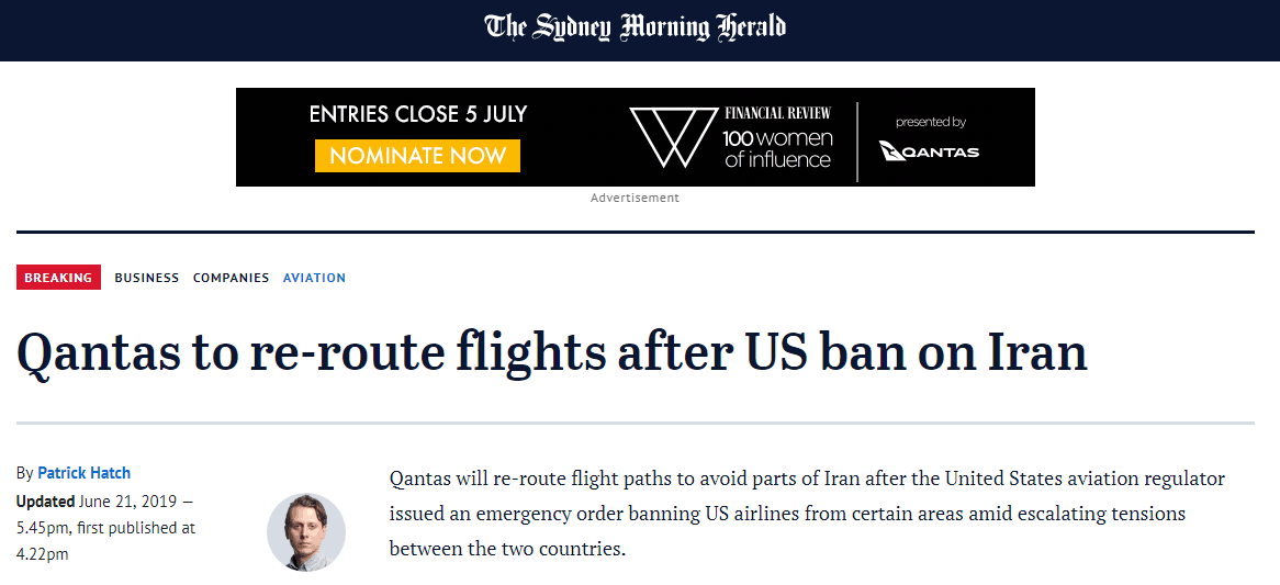 据报道,FAA在另一份给航空公司的通知中说,根据飞行跟踪应用程序,最近发生伊朗击落美国无人机事件时,民用飞机正在距离美国“全球鹰”无人机约45海里的范围内飞行。