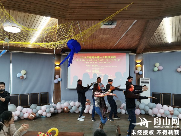 活动现场,外籍人士们参与“击鼓传花”、“你比划,我猜”等小游戏,并在舟山船拳代表性传承人孔建荣的带领下学习了这项极具舟山特色的拳术。