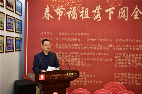 云南省迪庆藏族自治州德钦县副县长吴辰出席了此次活动,并代表活动协办单位作了发言。他说,德钦县素称“歌舞之乡”,是藏族圣山梅里雪山的所在,县境内主要居住民族是藏族,僳僳族等,藏族占人口总数的81%,是典型的多民族、多宗教地区。民族团结重在交心,要将心比心、以心换心。各民族同胞要手足相亲、守望相助,共同维护民族团结、国家统一。迪庆藏族自治州德钦县政府参与此次“春节福祖落下闳全球拜年”活动,并协调梅里雪山景区为活动提供景区门票作为年货,是希望能以春节文化连线,铸牢中华民族共同体意识,打造地区旅游文化升级发展新引擎,实现更大范围、更广领域、更深层次的各民族交往交流交融,努力创造各族群众共居、共学、共事、共乐的社会条件,让各民族像石榴籽一样紧紧抱在一起,让世界人民了解藏区,让藏区人民了解世界,努力探索更多民族团结进步的创新工作。