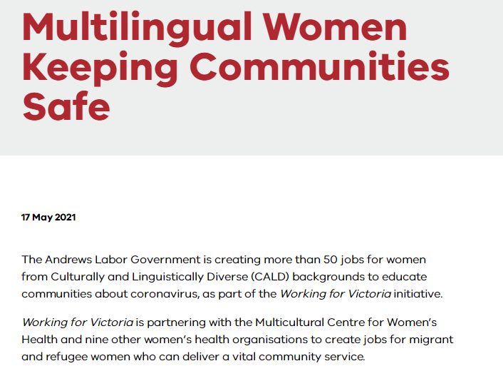 被雇佣的女性将直接参与维州多元文化社区的工作,以多语种的方式,帮助民众获取最新的防疫公共健康知识,以及其他女性健康信息。