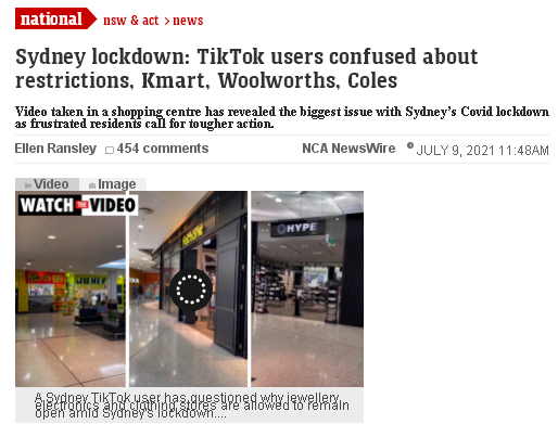 沮丧的悉尼居民纷纷登上社交媒体Tik Tok,质问在现在的封锁情况下为何服装店铺、珠宝店铺和电子产品店铺在商场内还在正常营业。