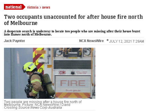 墨尔本北部11日晚一处房屋起火,两人失踪。