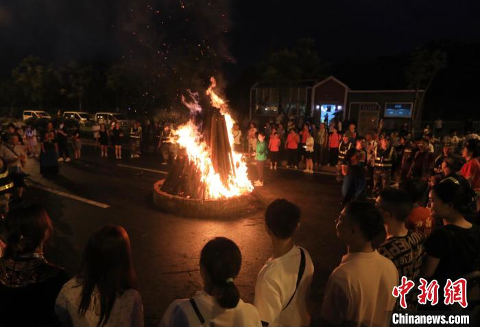7月29日晚,“激情火把节 最炫民族风”2024年凉山彝族火把节的“重头戏”火把狂欢夜在四川省西昌市举行,上万名当地民众和游客点燃手中的火把,载歌载舞欢庆彝族最重要的节日之一——火把节,沉浸式体验火把互动的激情与热烈。图为游客和当地民众围着火把堆跳起达体舞。中新社记者 王磊 摄