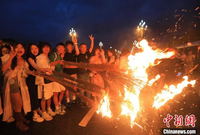 7月29日晚,“激情火把节 最炫民族风”2024年凉山彝族火把节的“重头戏”火把狂欢夜在四川省西昌市举行,上万名当地民众和游客点燃手中的火把,载歌载舞欢庆彝族最重要的节日之一——火把节,沉浸式体验火把互动的激情与热烈。图为游客和当地民众围观刚点着的火把堆。中新社记者 王磊 摄
