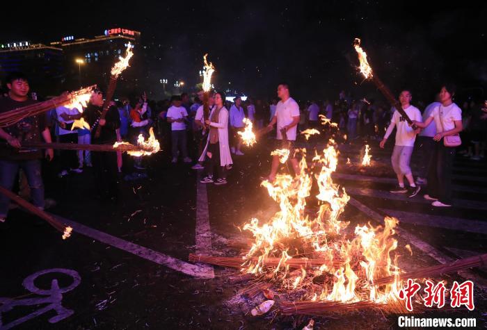 7月29日晚,“激情火把节 最炫民族风”2024年凉山彝族火把节的“重头戏”火把狂欢夜在四川省西昌市举行,上万名当地民众和游客点燃手中的火把,载歌载舞欢庆彝族最重要的节日之一——火把节,沉浸式体验火把互动的激情与热烈。图为游客和当地民众点起火把。中新社记者 王磊 摄