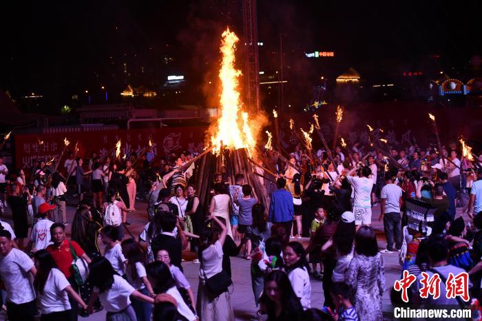 7月28日晚,四川西昌,2024年凉山彝族火把节西昌主会场在星月湖公园举行开幕式,当地民众盛装迎接,围着火堆跳达体舞。中新社记者 张浪 摄
