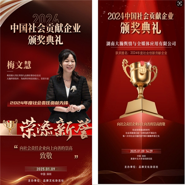 元月9日,在深圳举办的“2024先锋中国企业盛典”上,中国舆情学领域的开创者梅文慧教授荣膺文化品牌杂志评选的2024年度社会责任贡献先锋奖。与此同时,由梅文慧教授创办、已走过十载春秋的大瀚舆情智库,荣获2024年度社会创新贡献企业奖。