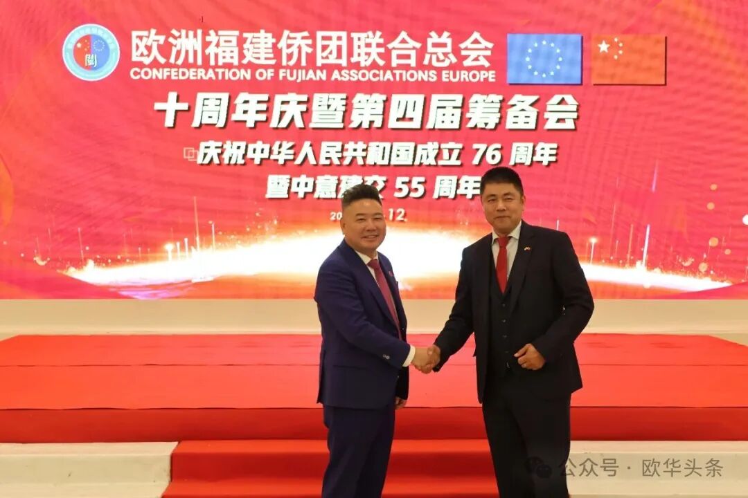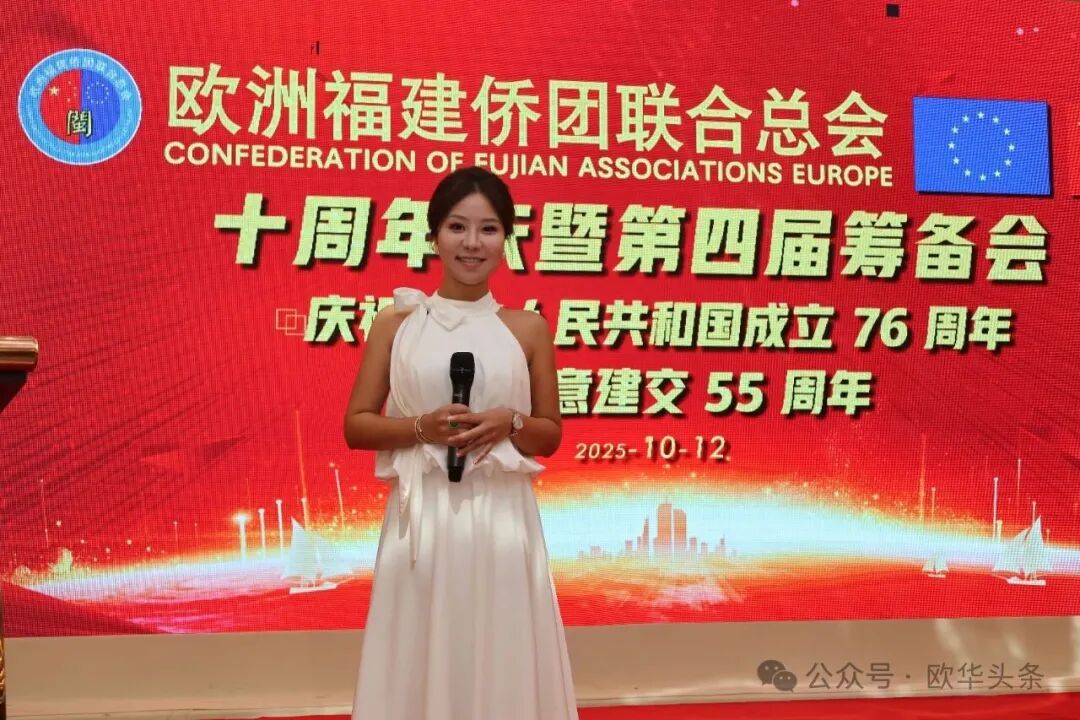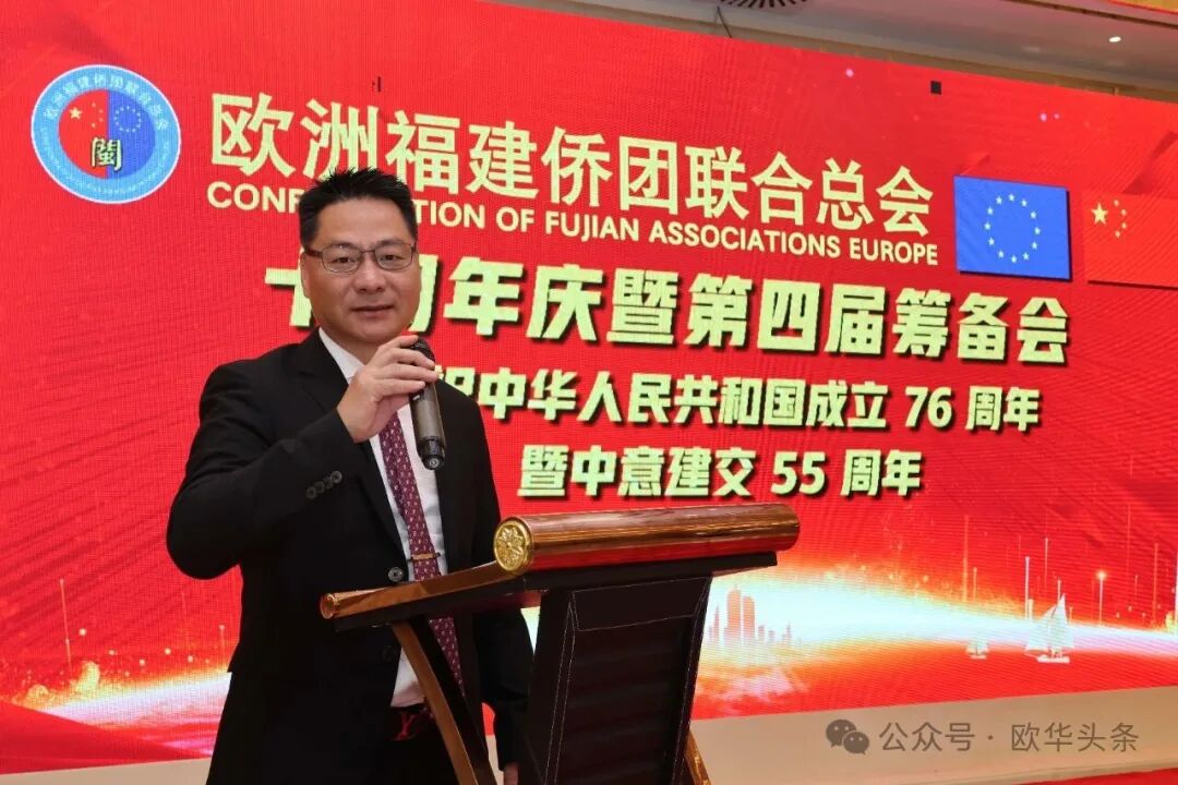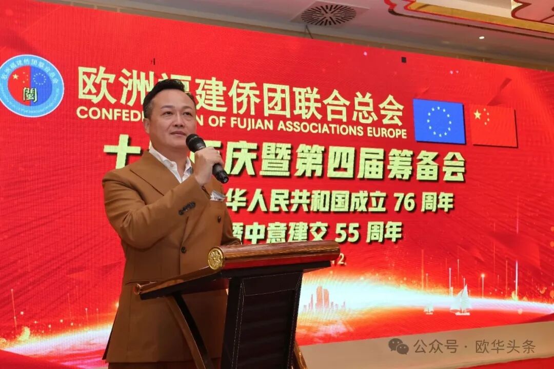在庆祝中华人民共和国成立76周年,中意建交55周年之际,2025年10月12日晚,华灯璀璨。欧洲福建侨团联合总会十周年庆典暨第四届筹备会在意大利普拉托聚福酒店隆重举行。来自欧洲十多个国家及意大利各地区的上百位侨领和嘉宾欢聚一堂,共同见证这一具有里程碑意义的盛会。 中国驻佛罗伦萨总领馆领侨处主任周莅淼、领事徐静媛莅临晚会现场。欧洲福建侨团联合总会第四届候任轮值主席胡建兵、首届轮值主席陈云斌、旅意福建华侨华人同乡总会会长郑文华,以及来自欧洲多国的侨团代表共同回顾欧福联十年发展历程,展望未来宏伟蓝图。 庆典在庄严的中华人民共和国国歌声中拉开帷幕,全场嘉宾通过《欧福联十周年纪念视频》,回顾十年风雨同舟、携手奋进的光辉历程,致敬闽籍侨胞在欧洲的奋斗足迹与团结精神。 胡建兵主席指出,十年的成长凝聚了每一位侨胞的心血和智慧,大家的支持与付出让欧福联成为海外福建人坚实的精神家园和温暖的港湾。展望未来,欧福联将以新的姿态继续发挥“桥梁纽带”的作用,搭建更开放、更务实的合作平台,凝聚侨心、汇聚侨力,服务社会、回馈桑梓,为侨胞提供更多的学习、交流与发展的机会。他强调,要进一步加强侨团间的沟通与协作,推动资源共享、信息互通,培养优秀华侨青年,让更多年轻力量参与侨务工作,传承侨团精神。欧福联将努力打造一个更加全面、温暖、具有凝聚力的侨胞之家,让每一位侨胞都能感受到家的温暖与力量。 胡建兵主席表示,十周年是新的起点,欧福联将继续坚持开放、务实、创新的理念,携手各侨团,共同谱写“侨连五洲、福泽四海”的新篇章。他最后衷心感谢大家的信任,推选他当选第四届轮值主席,并承诺将不负重托,带领欧福联迈向更加辉煌的未来,为广大侨胞和家乡建设贡献更多力量。 ▲欧洲福建侨团联合总会首届轮值主席陈云斌致辞。 陈云斌主席表示,十年来,欧福联在历届主席团和全体会员的共同努力下,团结旅欧福建侨胞,架设了中欧交流的桥梁,积极维护侨胞权益,热心公益回馈社会,展现了福建侨胞良好形象。展望未来,陈云斌指出,新一届总会将面临新的机遇与挑战,主席团成员应紧密协作,强化服务,推动创新发展,弘扬闽商精神,深化与各侨团及祖国相关部门的联系,关注乡亲需求,特别是在事业发展、子女教育和养老医疗等方面。他强调,要加强与年轻一代侨胞的互动,讲好侨乡故事,传承中华优秀文化和闽商精神,建设可信赖、温暖的侨胞之家。 陈云斌主席希望大家继续关心、支持和参与总会工作,共同把欧福联建设成为促进中欧友好交流的重要力量,并祝会议圆满成功,祝各位乡亲健康幸福。 ▲旅意福建华侨华人同乡总会会长郑文华致辞。 郑文华会长表示,大家齐聚普拉托,共同庆祝欧福联十周年。他代表旅意福建华侨华人同乡总会向欧福联致以热烈祝贺,并向历届领导班子和全体会员多年默默奉献表示崇高敬意。郑文华指出,欧福联自成立以来,始终秉持“团结互助、爱国爱乡”的宗旨,凝聚欧洲各国福建籍侨胞力量,积极推动侨界交流合作,为中欧民间友好和福建侨务事业发展作出了卓越贡献。他介绍,旅意福建华侨华人同乡总会自1999年成立以来,一直是福建省对外宣传侨务政策的重要窗口,会员与家乡保持密切联系,积极参与家乡建设,在服装、餐饮、机械、皮革等多个行业创业发展,并与当地商界开展合作,为侨胞群体创造了良好发展环境。 郑文华会长特别提到,去年11月,总会荣获“侨社之星”殊荣,这是对旅意福建侨胞多年团结奋斗、热心公益、情系桑梓的高度肯定。他衷心感谢中国驻佛罗伦萨总领事馆、兄弟侨团及家乡侨务部门的支持与指导,并表示未来将继续团结奋进、携手同行,增强侨社凝聚力,讲好福建故事,弘扬闽商精神,为中意友好和侨界发展贡献更大力量。最后,他预祝欧洲福建侨团联合总会十周年庆典圆满成功,并祝各位身体健康、事业兴旺、阖家幸福。 ▲驻佛罗伦萨总领馆领侨处主任周莅淼发表讲话。 周莅淼主任向欧福联十周年表示热烈祝贺,并高度评价广大旅欧侨胞为促进中欧民间交流、推动福建与欧洲地方合作所作出的积极贡献。他希望欧福联继续发挥桥梁纽带作用,团结侨界、服务侨胞,为中意关系和福建侨务事业发展贡献新的力量。 ▲旅意福建华侨华人同乡总会文艺部副部长陈丽主持当天的庆典大会。 ▲在庆典仪式上,北京巨微艺术研究院院长、国家一级美术师孙磊先生向欧福联赠送题为“瑞气祥云”的书画作品,寓意欧福联立德立业、传承精神、行稳致远。 庆典活动圆满礼成,在《爱拼才会赢》的熟悉旋律中落下帷幕。与会嘉宾纷纷合影留念,共同记录这一属于全体欧洲闽籍侨胞的荣耀时刻。在热烈欢快的气氛中,全体嘉宾共同举杯庆祝。祝愿欧洲福建侨团联合总会十周年生日快乐,祝愿中意两国友谊长存,福建侨胞事业蒸蒸日上,祖国繁荣昌盛、国泰民安。