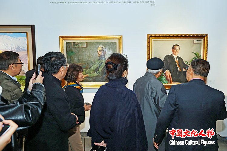 中央美术学院原院长靳尚谊与参观展览的艺术家嘉宾在展览作品前交流