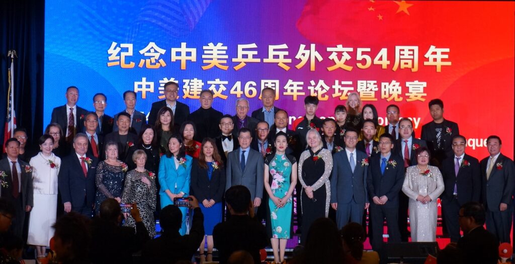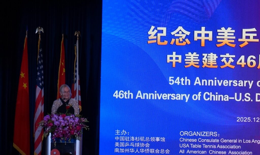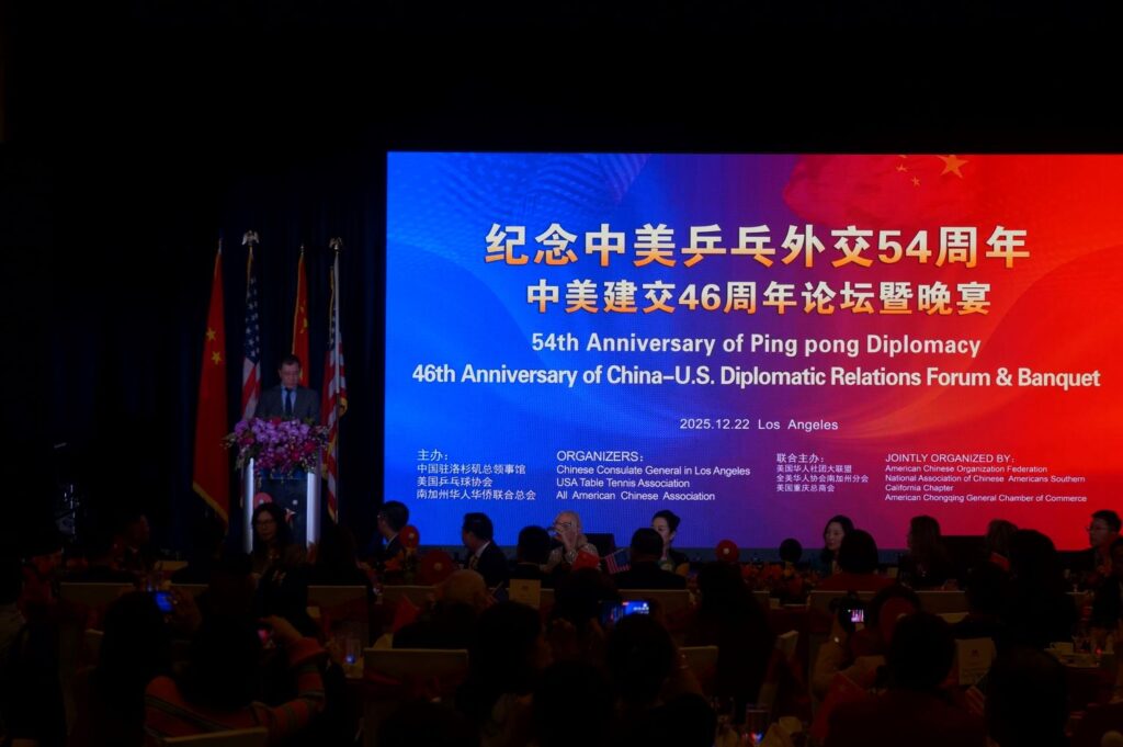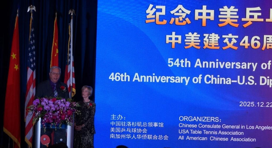 (洛杉矶,2025年12月23日李燕)—枚轻盈的银球,曾转动地球;如今,它在—代又—代青年手中,传递着不变的友谊。当地时间12月22日,在纪念中美“乒乓外交”54周年论坛暨晚宴上,最动人的焦点不是沉重的历史回顾,而是洋溢在球台周围的青春笑脸与真挚对话。这场由中国驻洛杉矶总领事馆、美国乒乓球协会及美国南加州华人华侨联合总会主办的活动明确宣告:中美关系的未来,正由青年携手书写。