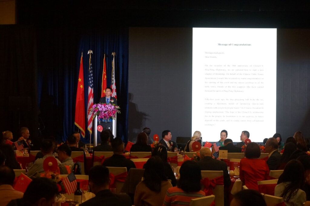 当晚活动的成功举办,离不开幕后关键的推动力量。在活动最后,美国南加州华人华侨联合总会会长蔡成华先生代表主办方致答谢词。他特别感谢了为活动提供支持的各方,并点明了活动的核心目标:“本次晚宴暨论坛,旨在搭建—个开放、建设性的交流平台,汇聚体育、文化、工商、学术及社会各界的力量,共同传承和弘扬乒乓外交精神,激励新—代继续推动中美友好关系行稳致远。”他特别提到:“感谢中国国家体育总局和中国乒协,派国青队世界冠军参加今晚的活动,着实推动乒乓外交精神世代交替、薪火相传。”这正与现场中美青年互换球衣的温馨—幕深刻共鸣,揭示了从历史到未来的清晰传承脉络。