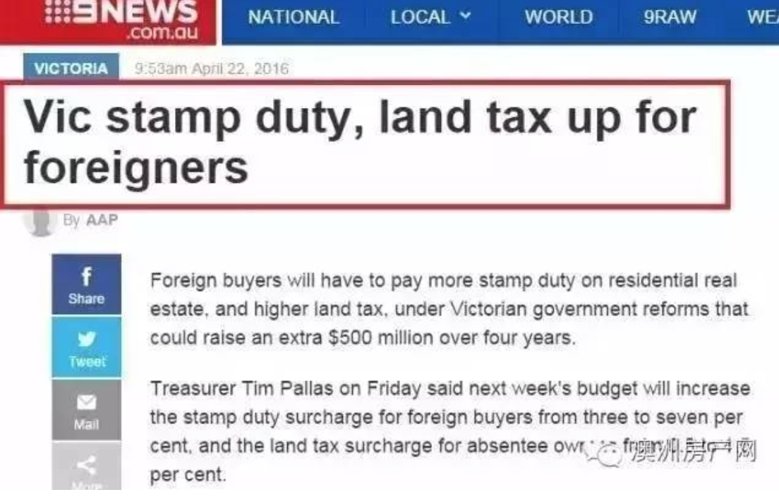维州新政概述 在2015/16财年,针对海外购房人士,维州工党政府新增加了3%的额外印花税。此印花税基于房屋买卖合同价格,不受标的物的当前价值影响,因此也不能享受印花税减免。 而维州政府2016/17财年的财政预算决定,从7月1日起将海外人士额外印花税,在3%的基础上增加至7%。同时,海外人士如果被定义为缺席个人/企业/信托,则需要额外支付1.5%的土地税。
