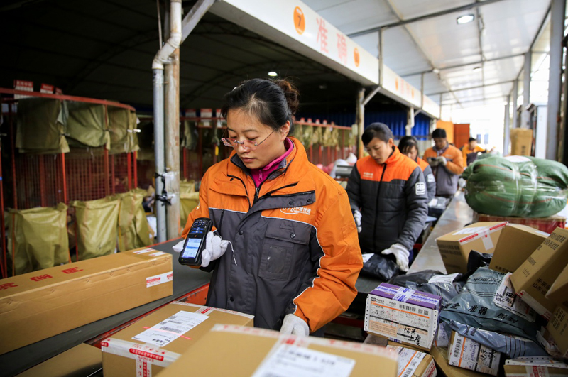 11月2日,山东滕州一快递公司的扫描员在对快件称重扫描。