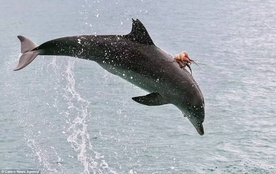 海豚看起来玩得超级High,可怜的章魚紧紧抓住海豚怕再次被甩...