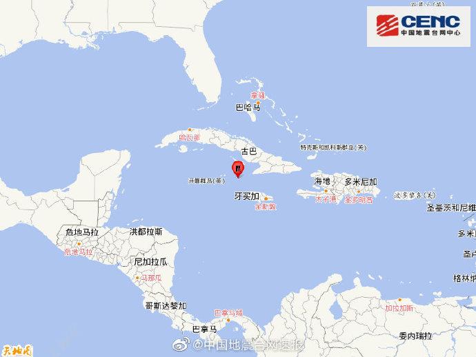 据中国地震台网正式测定:01月29日03时10分在古巴南部海域(北纬19.46度,西经78.79度)发生7.7级地震,震源深度10千米。图片来源:国家地震台网官方微博