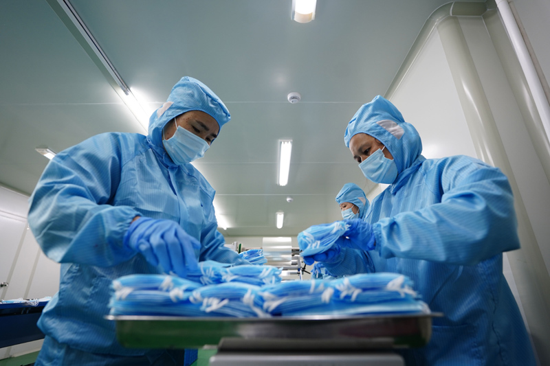 4月8日,江西省金洹医疗器械股份有限公司工人在生产口罩。江西南昌经济技术开发区拥有数家医疗器械生产企业。新冠肺炎疫情发生后,该开发区鼓励并扶持企业生产防疫