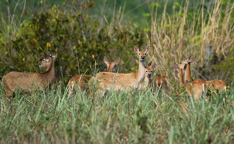 在海南邦溪坡鹿自然保护区,坡鹿在保护区内驻足休息(4月3日摄)。海南拥有我国分布最集中、保存最完好、连片面积最大的热带雨林和众多特有的动植物种类,是我国热带