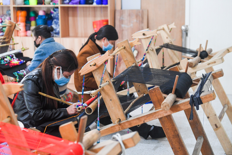4月8日,工作人员在小南海镇扶贫车间内编织土家织锦。近期,重庆市黔江区小南海镇积极引导当地扶贫车间在做好疫情防控的同时,有序复工复产,带动当地群众尤其是建档