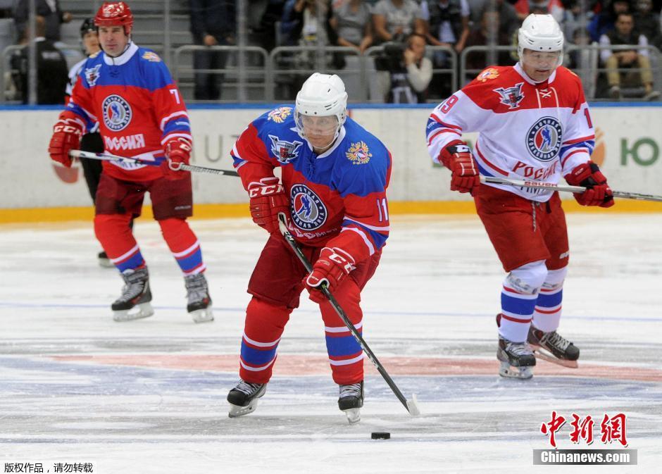当地时间2016年5月10日,俄罗斯索契,俄罗斯总统普京参加冰球比赛,与NHL球员竞赛,亲自上阵打冰球秀高超球技,最终普京所在的队伍最终于11比5获胜。