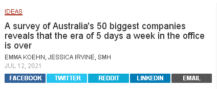 澳洲员工在办公室每周工作5天的时代似乎已经结束了,在近日受访的公司中,有42家公司确认对员工永久采用混合工作政策。澳洲50家最大的公司,它们在澳洲和海外雇佣了