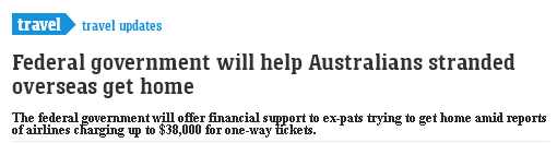 由于目前返澳的单程机票的票价平均高达3.8万元(澳元,下同),联邦政府将为试图返澳的滞留澳人提供财政支持。自从澳洲总理莫里森(ScottMorrison)宣布,为应对新冠肺炎