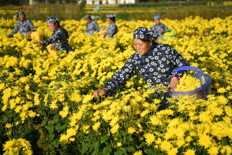 江西省修水县大椿乡新庄村圣民菊花合作社的菊农采摘金丝皇菊(11月3日摄)。日前,江西省修水县大椿乡新庄村种植的260亩金丝皇菊竞相绽放,当地菊农抓住晴好天气加紧