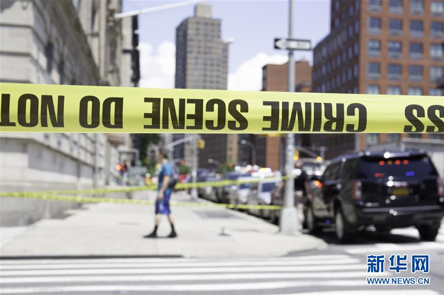 6月27日,在美国纽约,警方封锁发生脱轨事故地铁站附近的街区。美国纽约曼哈顿A线地铁27日发生一起车厢脱轨事故,造成34人受轻伤。新华社发(许可爽摄)